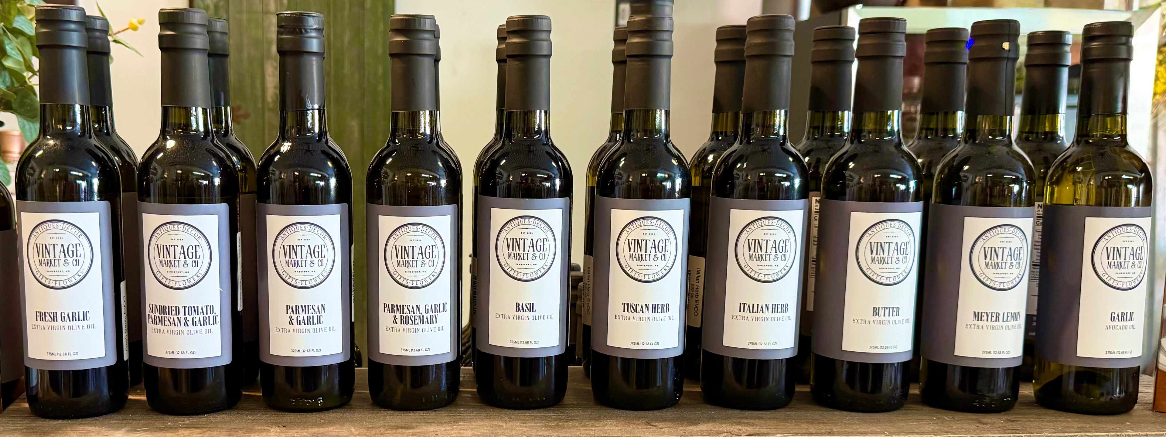 16 oz Fresh Mozzarella, sliced Handful of Cherry Tomatoes or 2 Sliced tomatoes 1/4 cup Fresh Basil. chopped or whole 3 T Vintage Market & Co Italian Extra Virgin Olive...