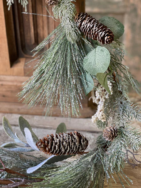 Glistening with the beauty of winter, the Iced Pine & White Berry Garland - 6 Foot is a stunning mix of iced pine, spruce, eucalyptus, pine cones, and lambs ears. Adorned with clusters and singular white berries and accented with branching details, this garland is generously dusted with glitter and light snow for a truly magical touch.
